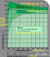 根據右圖可知,傳統鍋爐的熱效率隨著負荷的減小而降低,在70%的負荷以上,熱效率尚能保持在80%以上,在30%的負荷下,熱效率下降到70%以下。而冷凝鍋爐恰恰相反,滿負荷運行時鍋爐熱效率只有98%,30%負荷運行時鍋爐熱效率高達109%,相比較于傳統鍋爐,節省天然氣30%以上。