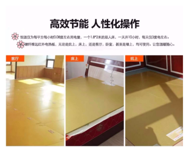 2、正常運行的電熱能直接轉化為熱能。在通電十幾秒內,發熱體表面溫度迅速升高,使覆蓋物表面溫度不斷升高,幾分鐘后,發熱體以及隔熱材料之間達到熱態平衡,地面以恒定的溫度進行熱使用運行成本非常低。3、電熱板厚度只有05公分到3公分,可根據需要,選用不同功率靈活鋪設在地面、墻面和吊頂上。可廣泛應用于家庭、辦公室賓館、桑拿浴室、孵化場等一切需要供暖的場所。不占用任何室內平面空間,使室內空間可以更靈活地布置和安放家具,享受使用更大空間,碳纖維電熱炕板的優點